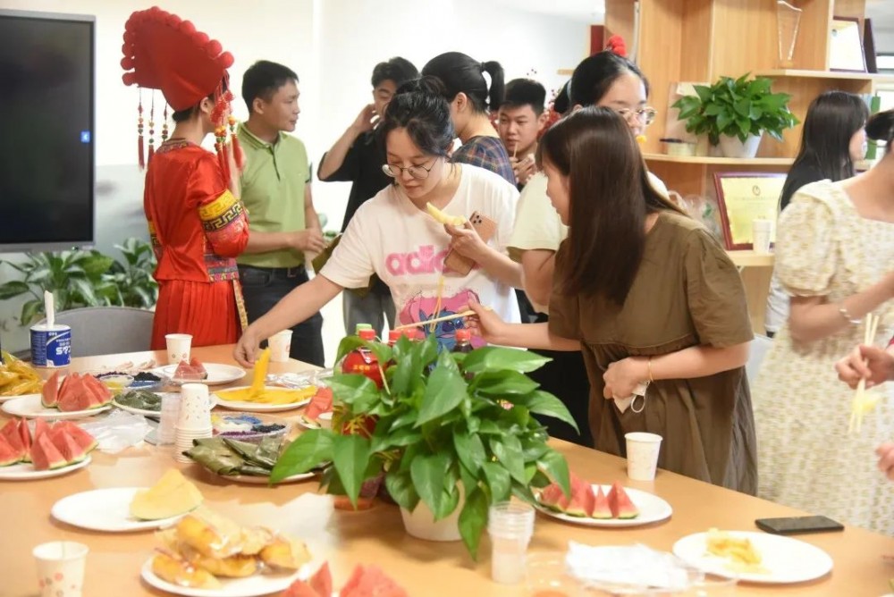 春色融融三月三,又是壮乡欢歌时。当熟悉的旋律响起,公司的活动区开始热闹起来。大家围坐在一起,品尝壮族特色小吃五色糯米饭、糍粑以及充满春天芬芳的青团,将壮族风情和春日气息吃进了嘴里,品到了心里。在品尝美食的同时,大家还观看了“三月三”节日的宣传视频,了解“三月三”的节庆知识。在欢乐的音乐中,干部职工畅聊各自的节日趣事,场面热闹非凡,其乐融融。