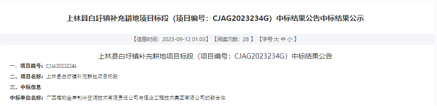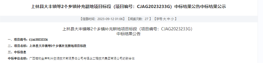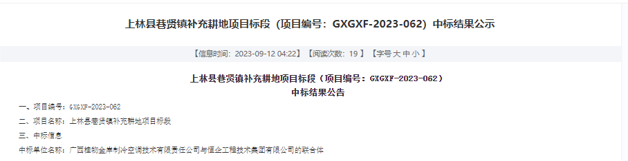 近日,由桂物金岸公司为主要牵头人的联合体成功中标上林县大丰镇等3个镇补充耕地项目8000亩,合同金额预计2.4亿。